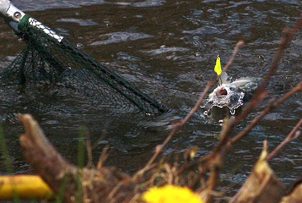 Boah, endlich hat es geklappt. Nach vielen Fehlversuchen blieb eine Forelle hängen und ist sicher an Land.