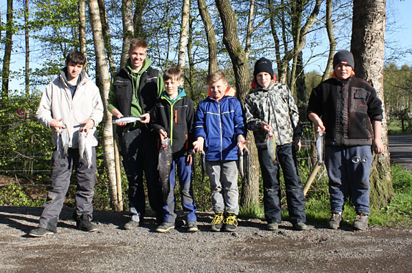 Die traurigen Gesichter täuschen.....es war ein schöner Angeltag mit guten Fängen. 6 Jugendliche und 5 Betreuer fingen 32 Forellen, davon eine Lachsforelle über 2kg. Natürlich wurden die Fänge am Ende gerecht verteilt, sodass jeder eine ausreichende Mahlzeit mit nach Hause nehmen konnte. Ohne Fang bleib jedoch niemand! Die traurigen Gesichter hängen dann wohl doch eher mit dem Einpacken zusammen.......