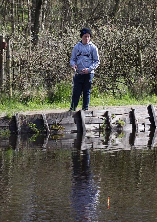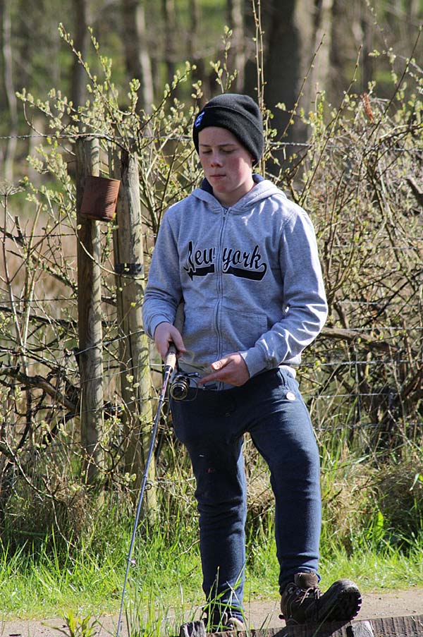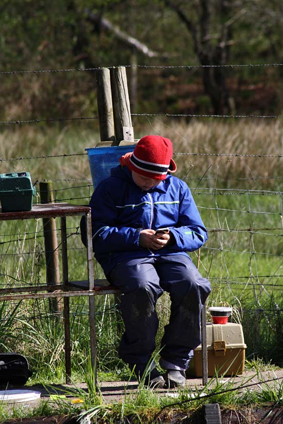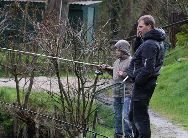 Jannis tippelt auf dem Handy und Kendrik behält die Rute in den Händen ..