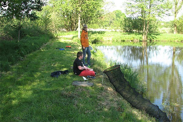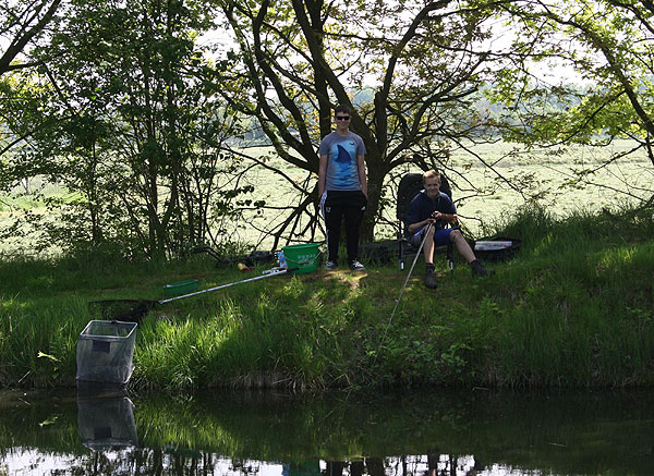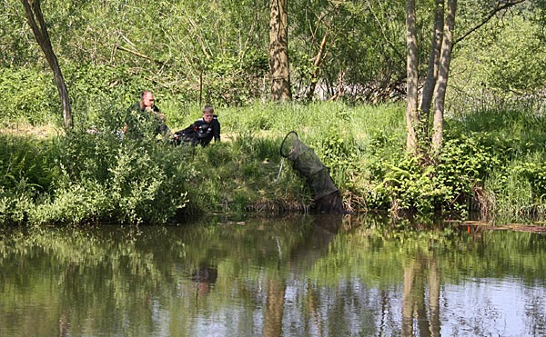 Mathias sitzt hier bei Ben, der erste gehakte Karpfen ging leider verloren ..