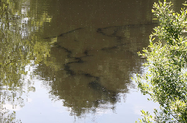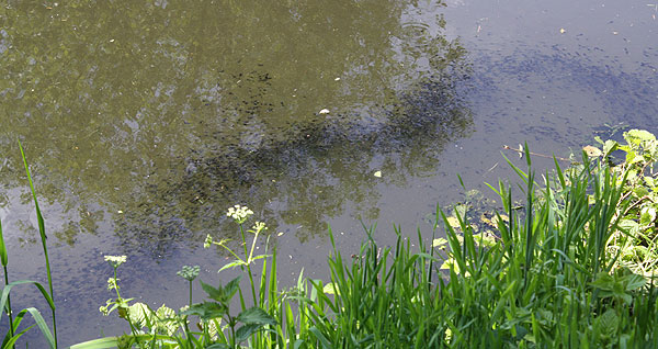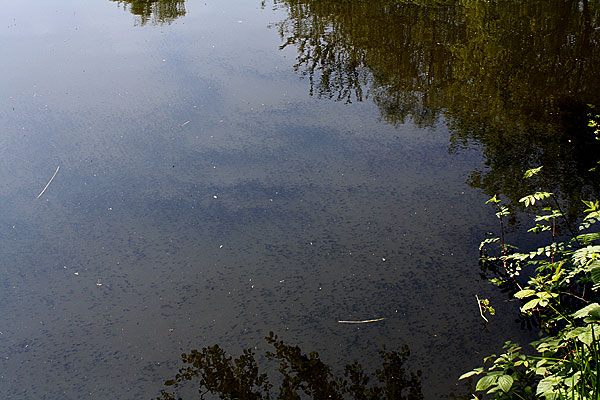 .. die Anzahl der Kaulquappen zeichnet viele gut sichtbare Muster an der Wasseroberfläche ..