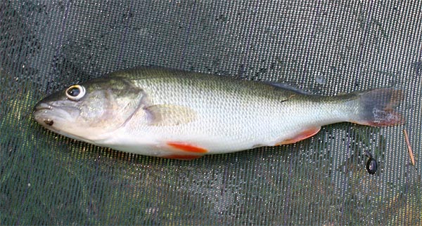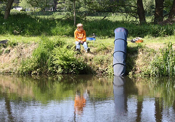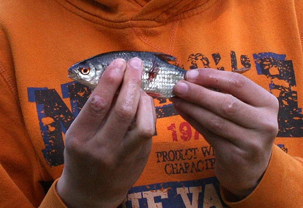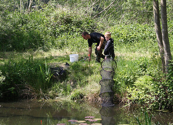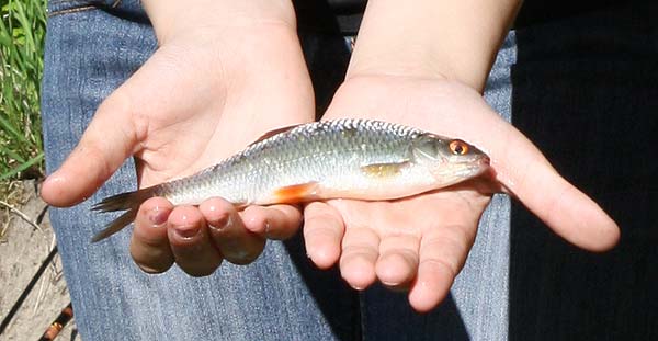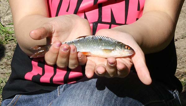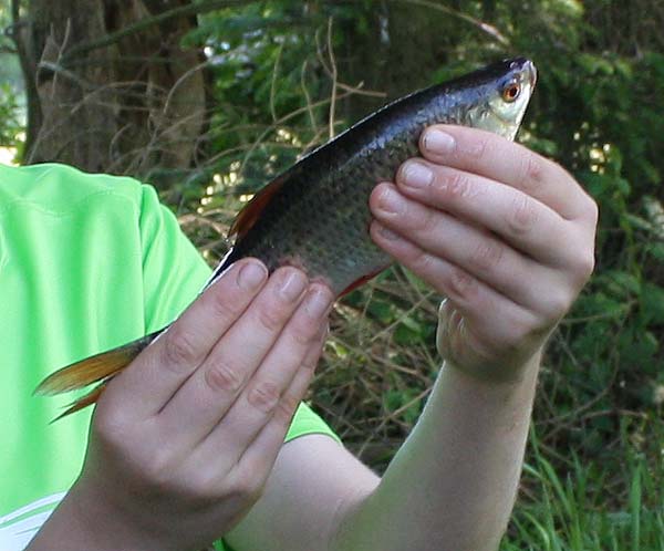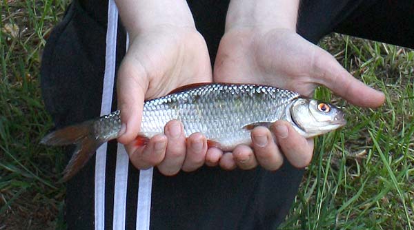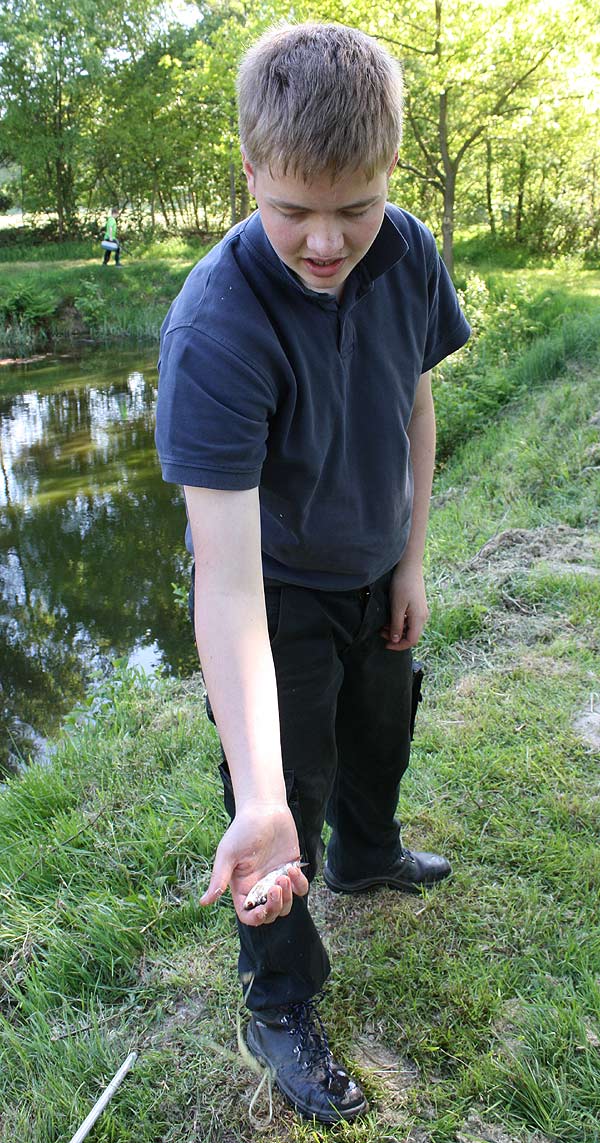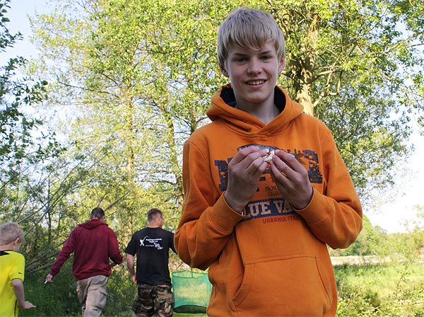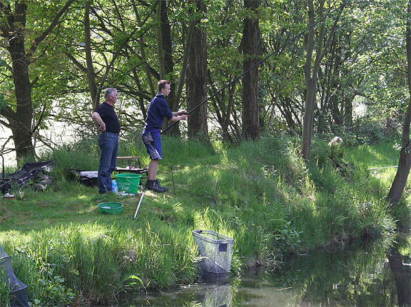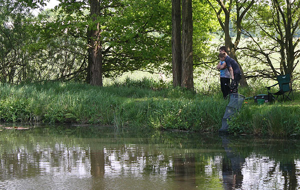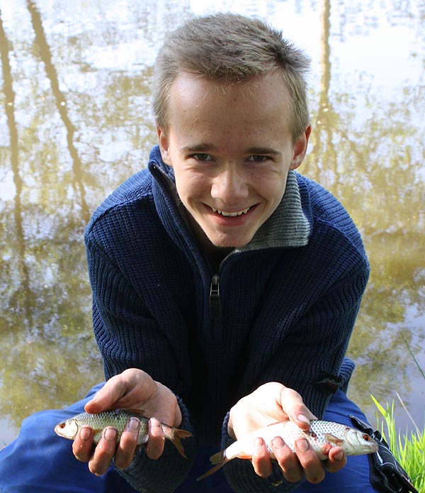 Tobias hat ein Rotauge am Haken, Justin hilft bei der Bergung ..