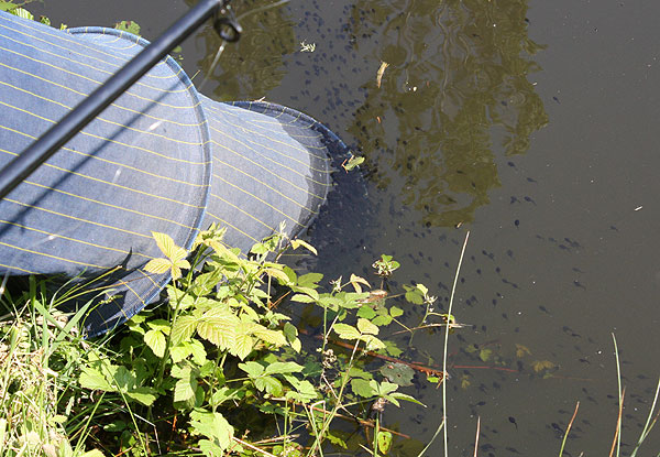 .. die Kaulquappen schwammen um die Hindernisse am Ufer ..