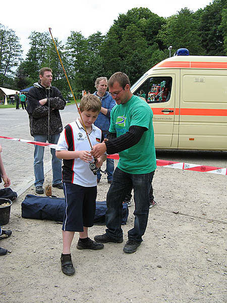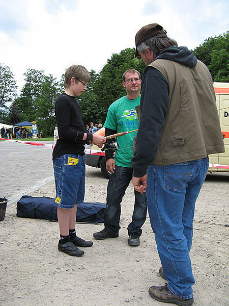 Gewässerwart Michael erklärt hier die Technik um Rute und Rolle ..