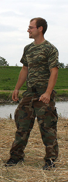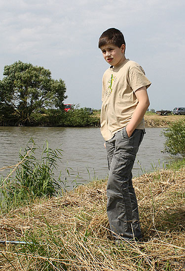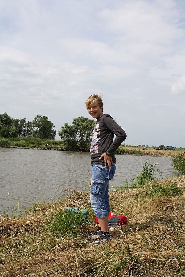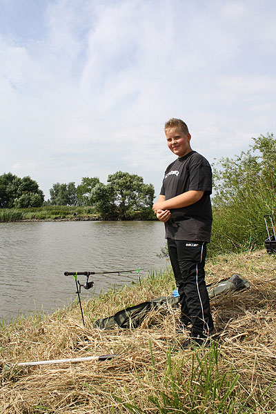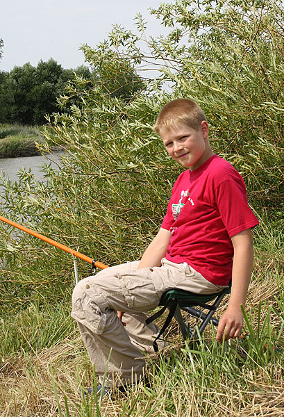 Unten sieht man Lukas mit einer kompletten Ausrüstung für das Angeln mit der Kopfrute.