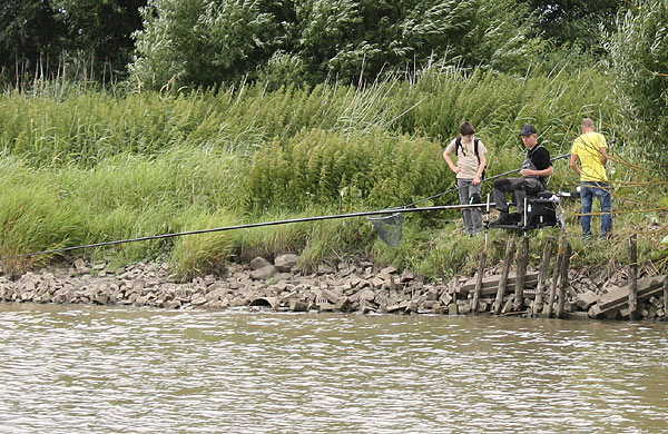 Ein viel bevölkertes Ufer, überall Ruten und sonstiger Angelkram den man so brauchen kann.