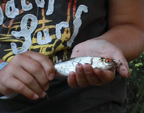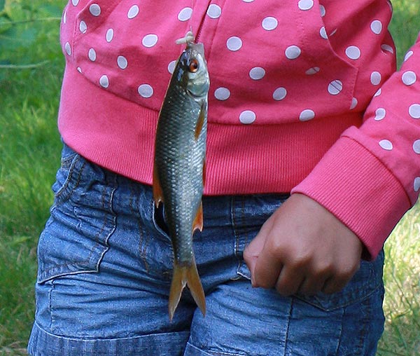 .. der Jugendwart zeigt Robin wie er den Fisch sicher halten kann ..