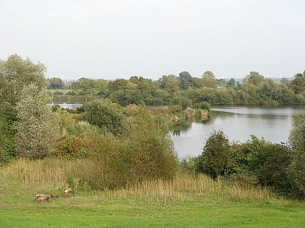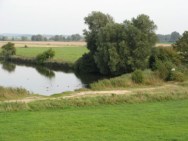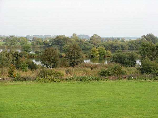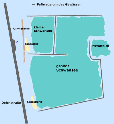 Vom Deich aus sieht man links den kleinen Schwanensee, dahinter und rechts befindet sich der große Teil des Schwanensee.