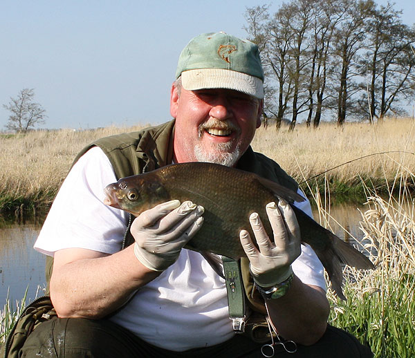 .. schöner Brassen .. Die Handschuhe trägt er nicht, weil er den Fischschleim nicht mag, sondern weil seine