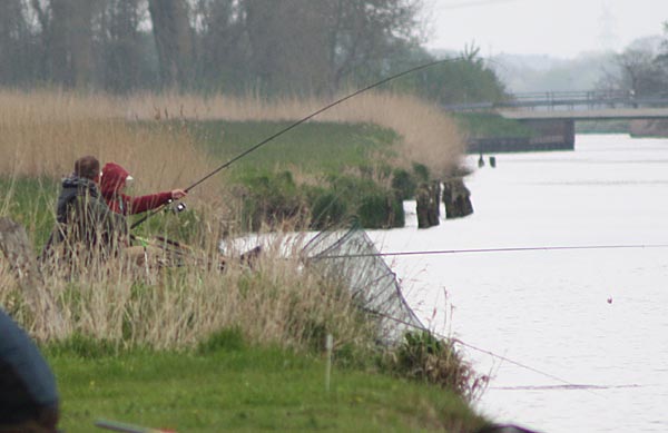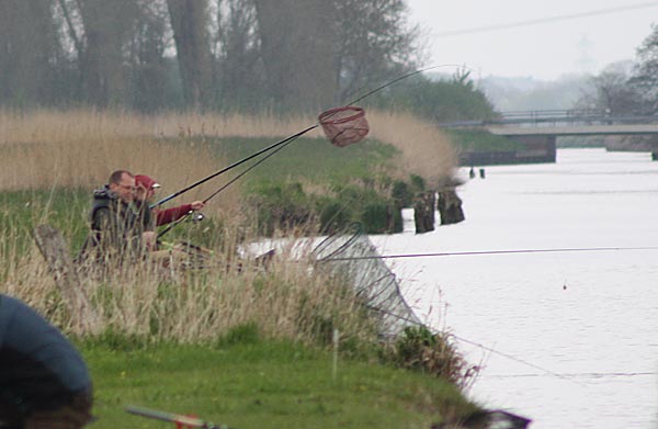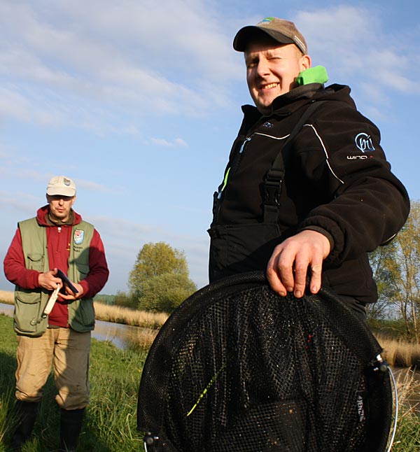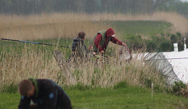.. da kommt schon der Kescher; dann ist ein Fisch am Haken ..