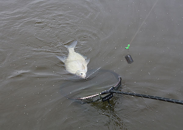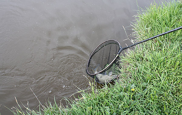 .. bis der Fisch über den Rand des Keschers geführt wird ..