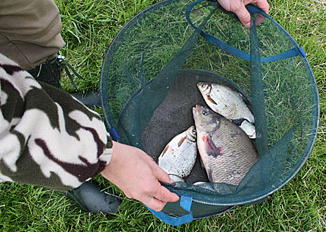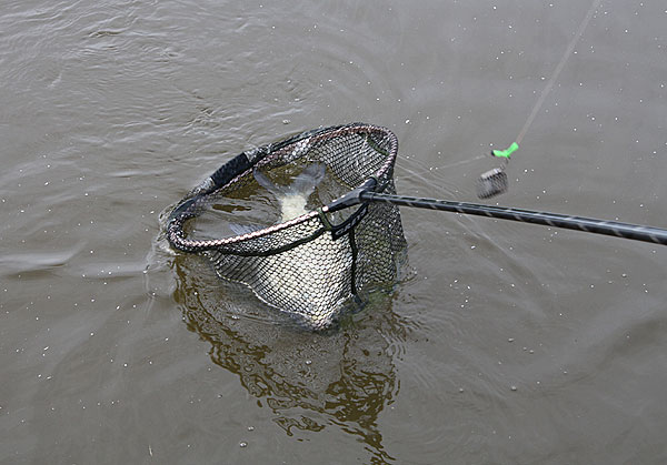 .. am Ufer angekommen, lässt sich Kescher samt dem Fisch Kräfte schonend entnehmen.