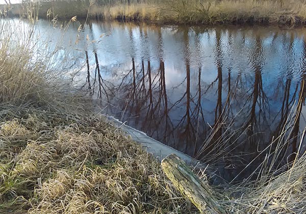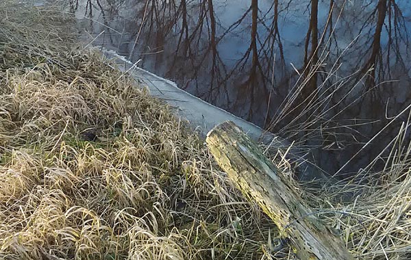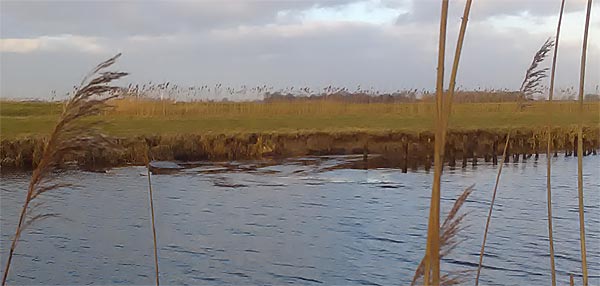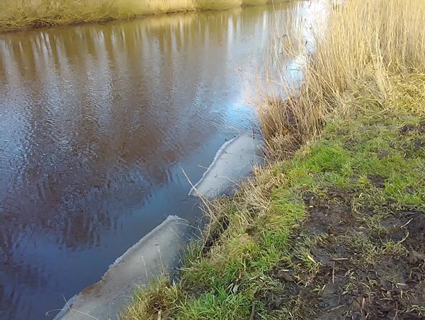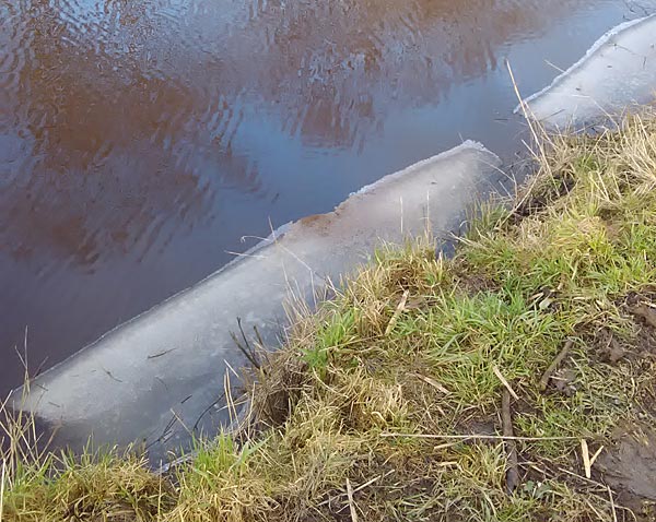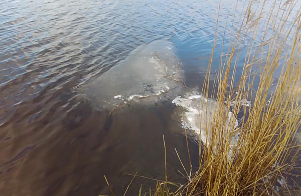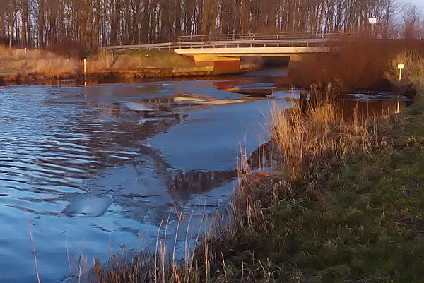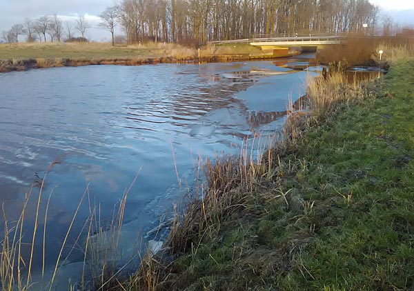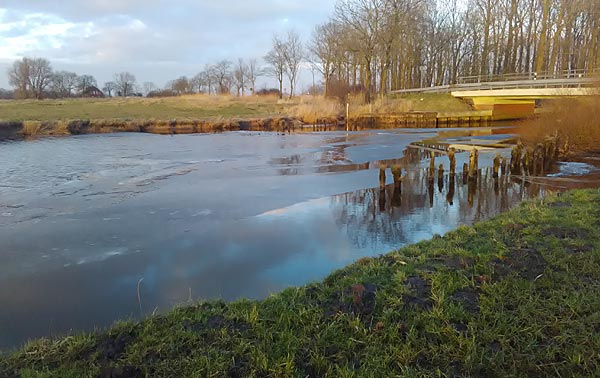 .. zwischen Schilfwiese und der Brücke befindet sich an einer Stelle eine etwas größere Eismenge ..