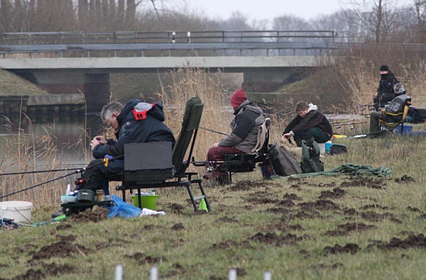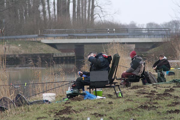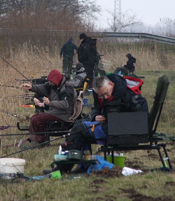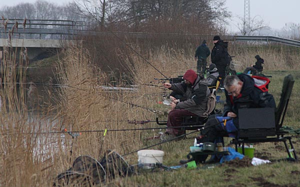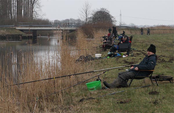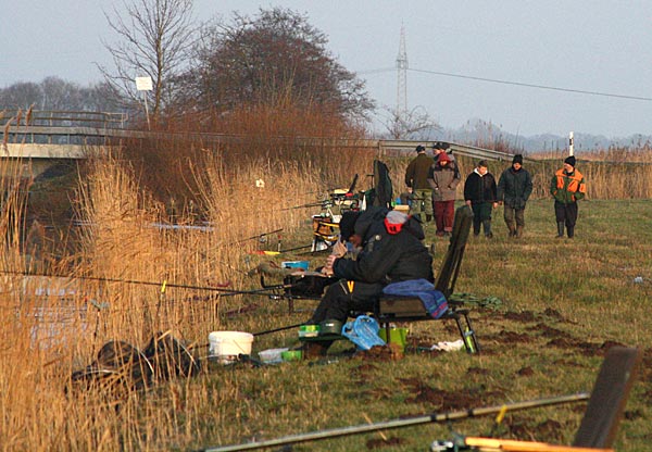Erste Grüppchen sammeln sich zum Klönschnack - auch in der Hoffnung, dass vielleicht ein Fisch anbeißt, wenn man gerade nicht auf die Rute achtet - eine bewährte Methode an der Drepte!